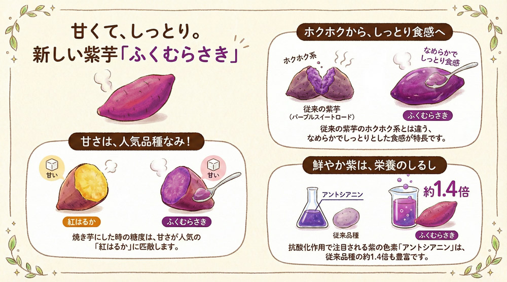 上の比較からもわかるように、ふくむらさきは従来の紫芋(パープルスイートロード)と比べて甘さ・食感の面で飛躍的に改良された品種です。